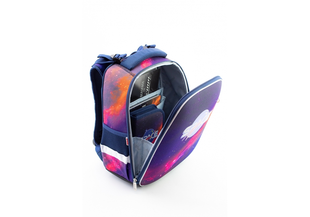 Dimensiune: 38 * 29 * 15cm; material: poliester 900 D / EVA; spate ortopedic, 2 compartimente cu fermoar, mâner robust; Buzunar pentru laptop; 3 compartimente pentru cărți; bretele ergonomice reglabile în formă de S; elemente reflectorizante pe toate laturile rucsacului; fund sigilat cu picioare din plastic, cleme metalice duble; loc pentru semnarea datelor individuale pe spate; greutate: 650 g. Garanție pentru defecte de fabricație 60 de zile.