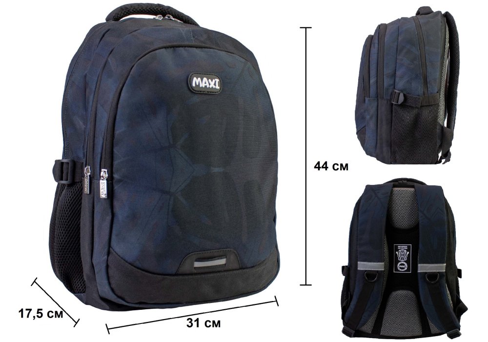Dimensiune 37 * 26 * 13 cm, compartimente - 1, buzunare - 2, material: poliester, spate anatomic cu inserții moi, curele ergonomice în formă de S, buzunare laterale, accesorii metalice, mânere puternice. Garanție pentru defect de producție de 60 de zile.