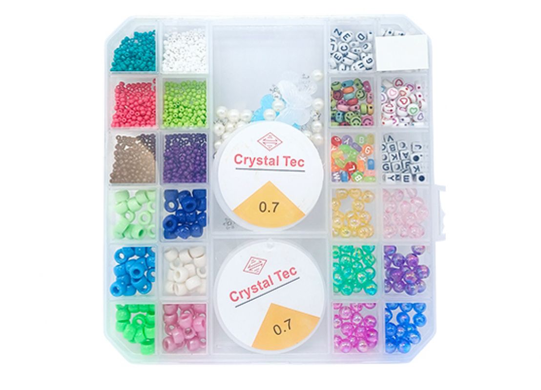 Include o varietate bogată de mărgele în culori vii, forme diverse și litere decorative, perfecte pentru realizarea brățărilor, colierelor sau altor accesorii personalizate. Setul conține și fir elastic Crystal Tec (0.7 mm), rezistent și ușor de utilizat, ideal pentru înșirare.