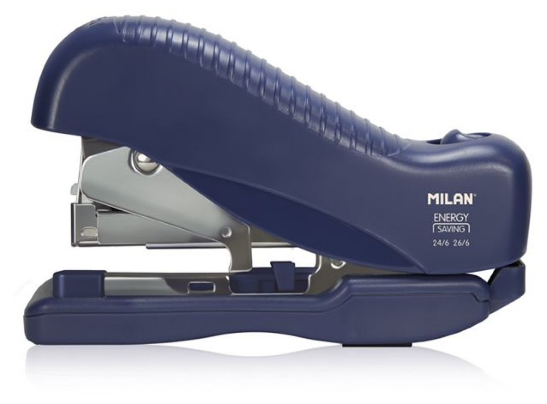 Capsator cu economie de energie (cu 30% mai puțină forță la capsare) cu corp din plastic albastru și bază anti-alunecare de 12,9 cm. Cu un buton pentru a înlocui cu ușurință capsele și vizualizatorul de capse. Design original creat de propriul departament R+D al MILAN. Capacitate de capsare: 30 de coli (5,5 mm). Capse: 105 capse 26/6 sau 100 capse 24/6. Capse incluse. Colecția 430 din 1918, inspirată de culorile și designul originale ale radierelor MILAN, fabricate în Spania din 1918.