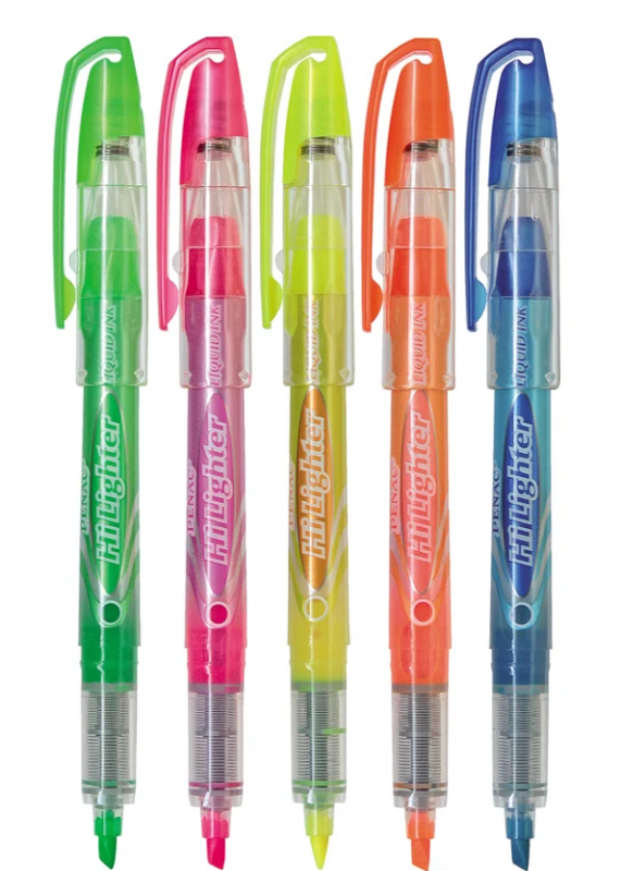 Evidențiatoarele de text Penac Hi Lighter sunt concepute pentru a evidenția textul pe orice tip de hârtie. Cerneala unică are un sistem Free Ink („cerneală lichidă”) care garantează performanțe ridicate atunci când este utilizată. Datorită cernelii speciale pe bază de apă, markerele nu se usucă fără capac timp de 4 ore, sunt inodore și se usucă instantaneu pe orice tip de hârtie, fără a o satura sau murda textul. Vârful teșit, rezistent la uzură, vă permite să desenați perfect chiar și linii subțiri de la 1 la 4 mm, nu este supus deformării și scrie încet. Rezistența ridicată la lumină și fluorescența cernelii asigură linii clare pentru mulți ani, fără a întuneca textul. Culoarea clemei și a corpului se potrivește cu culoarea cernelii. Culoare - albastru. Marcatoarele universale pentru desen sunt perfecte pentru evidențiere, schiță și litere.
