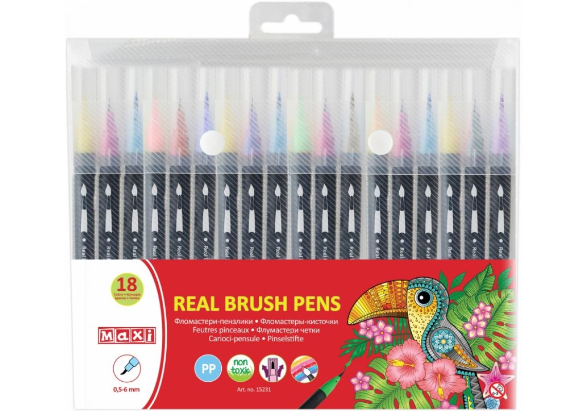 Stilouri cu pasla REAL BRUSH, 18 culori difera prin faptul ca penita este creata sub forma unei pensule cu peri sintetici. Aceasta permite trasarea liniilor de la 0,5 mm la 6 mm. Material caroserie: polipropilena (tip de plastic mai flexibil). Caz: rotund. Culori vii saturate. Cerneala pe baza de apa. Echipat cu un capac ventilat, care este mai sigur pentru copii in caz de inghitire.